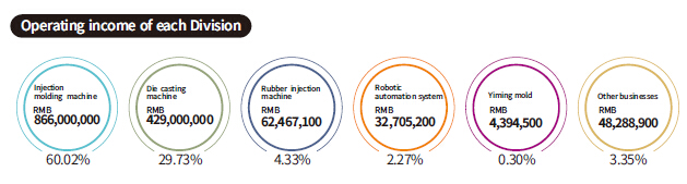 Pursuing diversified development in the equipment manufacturing industry, Yizumi has currently established various commercial divisions, namely, injection molding machine, die-casting machine, rubber injection machine, high-speed packaging machine, robotic automation system and Yiming Mold. Especially, in 2016 as the A5 series servo energy-saving injection molding machine and the DP series two-platen machine were pushed into the market, the operating income of the Injection Molding Machine Division has reached RMB 866,000,000 by 32.49% over the previous year.