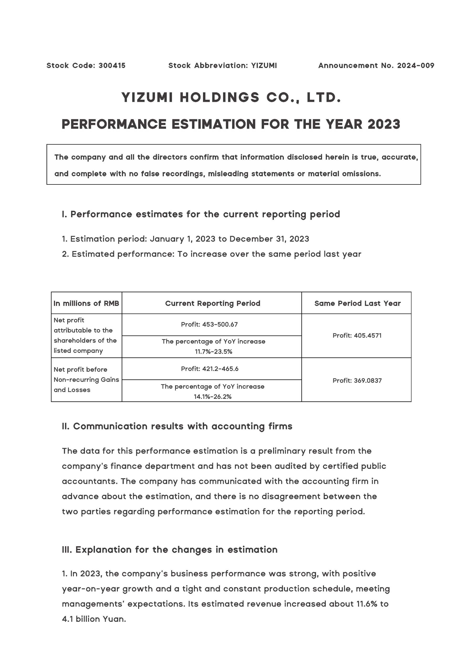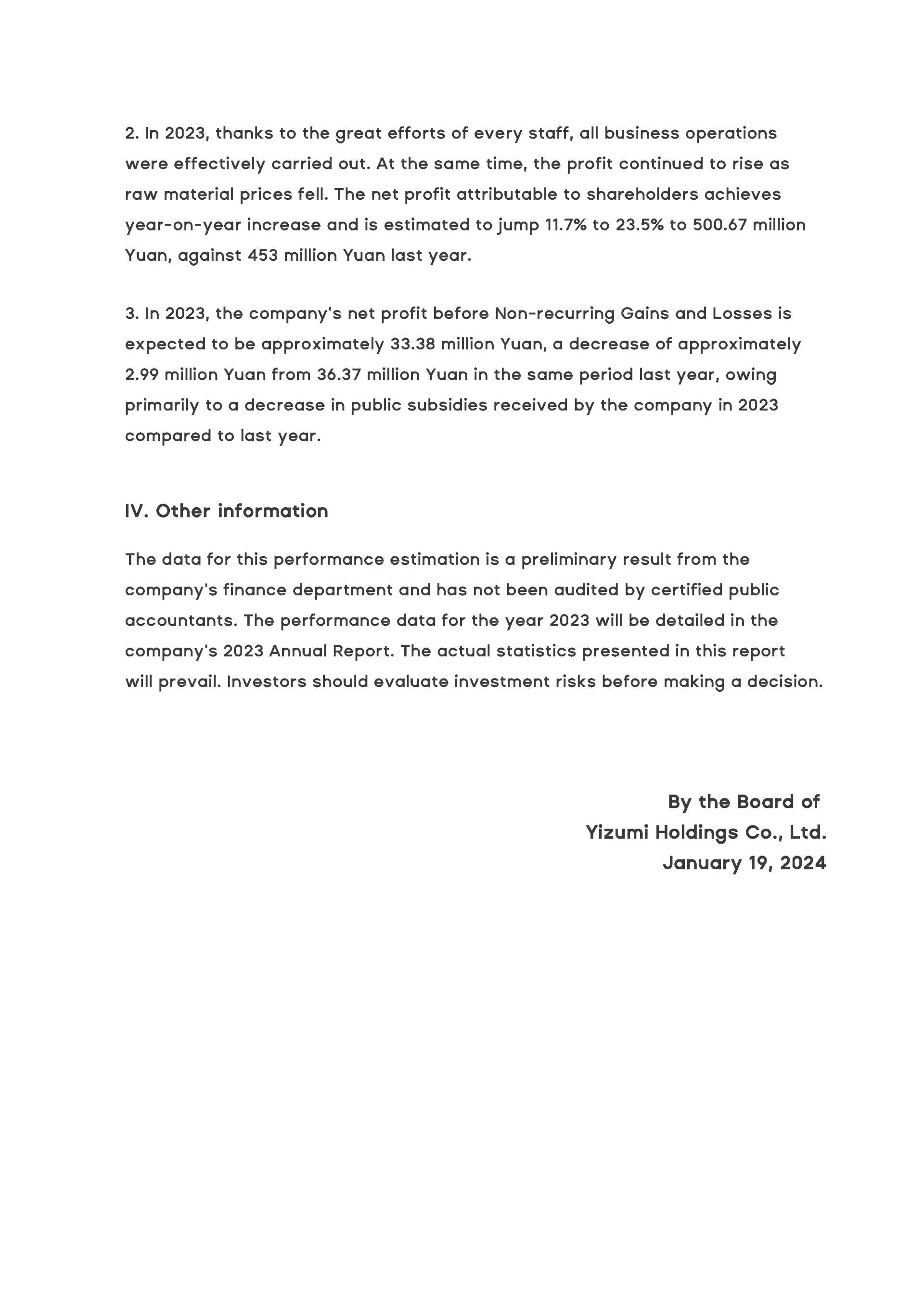 On January 19th, YIZUMI announces the estimated result for 2023. Its revenue from operations is expected to increase by 11.6 percent YoY to around 4.1 billion Yuan.