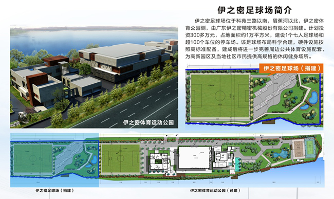 On the signing ceremony, Yizumi donated additional 3 million yuan for the construction of a new 7-player standard football field and supporting facilities, including a parking lot that accommodate more than 100 cars. It is the second time that Yizumi has voluntarily donated to sports facilities since the first donation to building Yizumi Sports Park in BOT (Build-Operate-Transfer) mode in 2012. The sports park, taking a total investment of 30 million yuan, consists of an exercise plaza, a football field and tennis and basketball courts. The outdoor fields have been put into use and the stadiums are under construction. They are expected to put into use in July 2015."Yizumi Sports Park mainly benefits employees working in high-tech industrial park and residents living around it. The sports facilities, the football field in particular, are very popular and often unavailable.” said Deputy Managing Director James Zhang. So Yizumi decided to spend 3 million yuan to build another football field to meet the needs of more citizens, better serve the staff and give back to the community as a local enterprise.