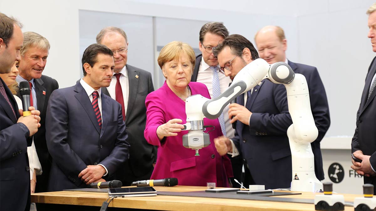 (At the Hannover Messe in Germany in 2018, German Chancellor Angela Merkel and Mexican President Enrique Peña Nieto operated co-robot Franka Panda)