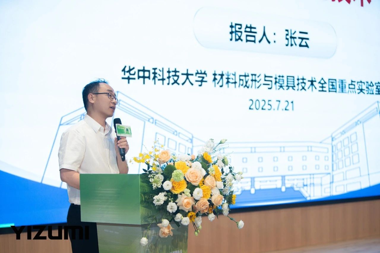 Professor Zhang Yun from Huazhong University of Science and Technology speaks on "Intelligent Technology for Material Molding". He explains that material molding influences both the form and performance of materials during processing, and intelligent technology is the key to improving the molding processes and equipment performance. He focuses on how AI, simulation, sensing, and data processing can be used to accurately design and control product shapes and material properties as they are processed.