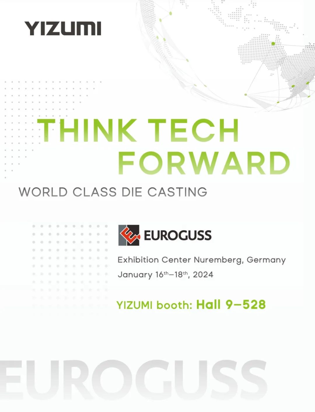 In the upcoming year 2024, YIZUMI will participate in the EUROGUSS 2024, which will be held in Nuremberg, Germany from January 16 to January 18. During the exhibition, YIZUMI will showcase the LEAP Series 530U, the hot chamber die casting machine HM90T, and advanced die casting technologies.