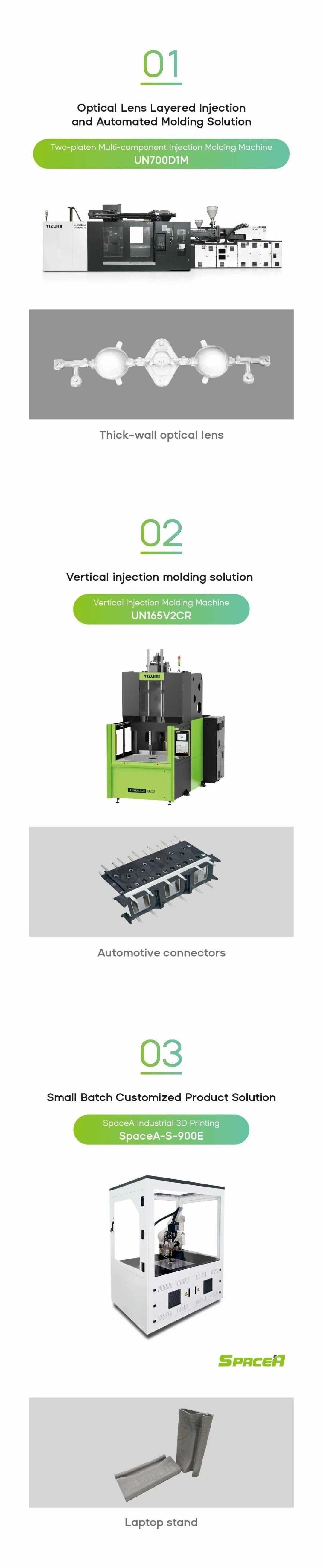 YIZUMI will showcase two injection molding machines: the UN700D1M and UN165V2CR, as well as the SpaceA-S-900E industrial 3D printer and their solutions.