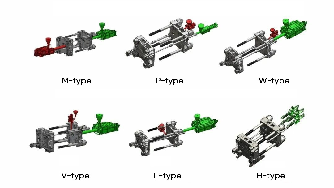 1. Modular design: four injection units are located on the side of the fixed mold in quadrangular structure, contributing to a more compact structure and smaller footprint.