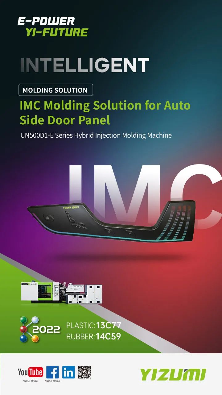 At K 2022, YIZUMI teamed up with Shenzhen Hesheng Chuangjie Technology Co. Ltd. to develop 3D automotive side door trim panels using IMC in-mold circuit technology. The process of IMC Molding Solution for Auto Side Door Panel is to print decorative patterns and conductive circuits on film substrates successively. Then, integrate the patterns and touch circuits into a 3D smart touch panel through injection molding process. It offers various advantages including light weight, free design, excellent performance, and simplified process.