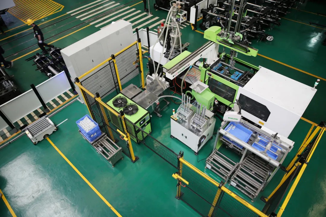 At YIZUMI's production workshop, there is an automated production line for safety door roller. The entire production process is carried out in automated operations, from raw materials feeding to injection molding, automatic conveying and embedding of bearing inserts, in-mold monitoring, automatic product picking up, packing and placing, warehousing, etc. The rollers produced are used for injection molding machine assembly to achieve self-sufficiency, eliminating the need for external procurement.