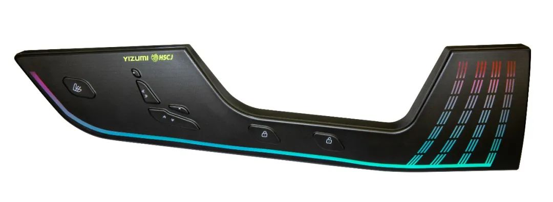 At IPF Japan 2023, the D1-E series hybrid injection molding machine is producing IMC panels for auto side doors. This solution is a 3D side door panel decoration product for auto developed by YIZUMI and its partner, Hesheng Chuangjie. By using the In-Mold Circuit (IMC) technology, the product allows 3D touch control. Decorative patterns are printed on film sheets, conductive lines are printed on ink decorative layers, and then patterns and touch control circuits are integrated into a 3D intelligent touch panel through injection molding.