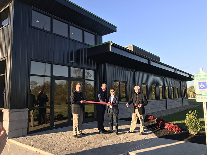 【图】北美新工厂开放日剪彩(左起:HPM北美总裁John Beary;伊之密橡胶机事业部总经理王诗海;伊之密注塑机事业部总经理张涛;HPM北美财务总监WilliamFlickinger)