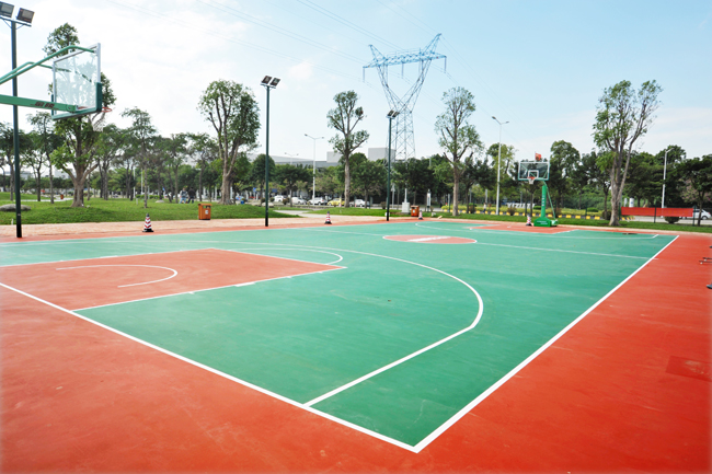 篮球场采用硅PU面层专业运动地面,上硬下弹,具有良好的反弹作用;其优质的弹性为运动员提供有效的缓冲吸收和减震保护;移动单臂篮球架,高强度安全玻璃篮板,为国家标准高强度安全钢化玻璃材料制成,完全胜任大型赛制及灌篮等激烈运动。