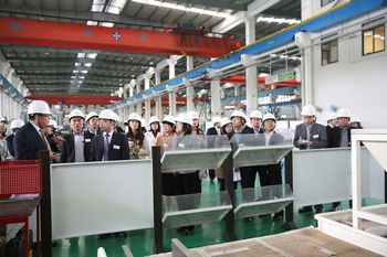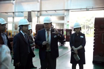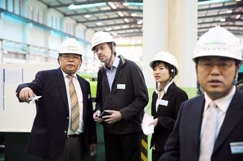 伊之密董事总经理甄荣辉(左二)陪同媒体伊之密董事总经理甄荣辉(右二)陪同媒体朋友参观注塑机车间