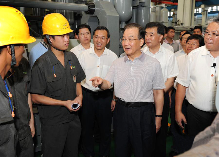 8月24日至25日,中共中央政治局常委、国务院总理温家宝来到广东省广州、佛山、东莞等地,就当前经济走势特别是稳定外需、加快外贸转型升级进行调研。这是24日,温家宝在广东伊之密精密机械股份有限公司考察时与工人们交谈。