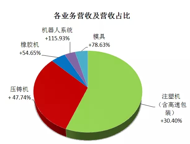 2017年,伊之密围绕模压成型专用机械设备领域多元化发展,创新产品研发和企业运营方式,积极布局全球市场,五大主要产品均得到全球客户的进一步认可。其中,随着伊之密压铸机销售收入的增长,机器人自动化系统的销售增幅领跑其他产品,销售收入达7,062万元,同比增长115.93%。