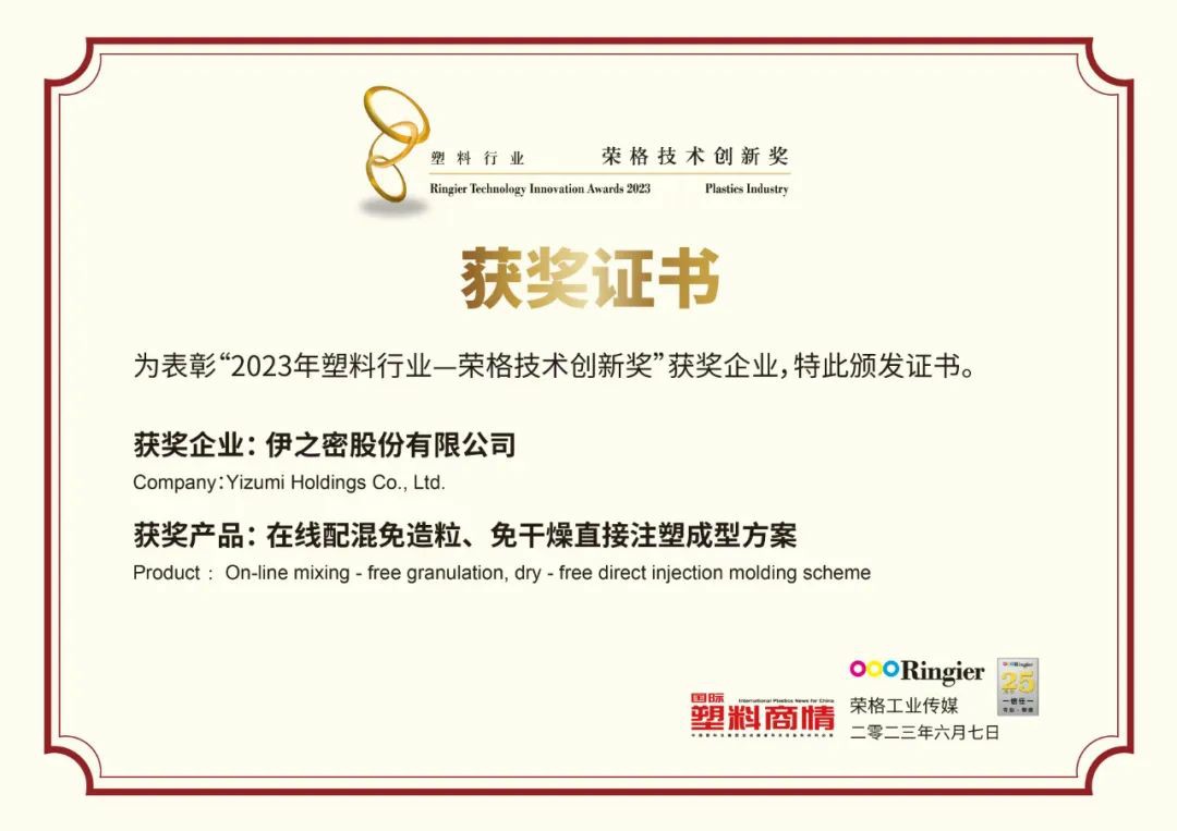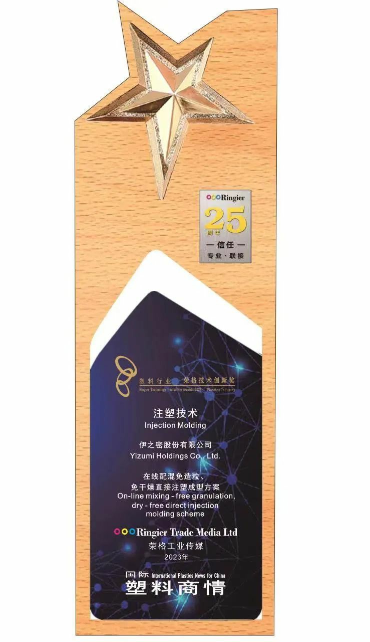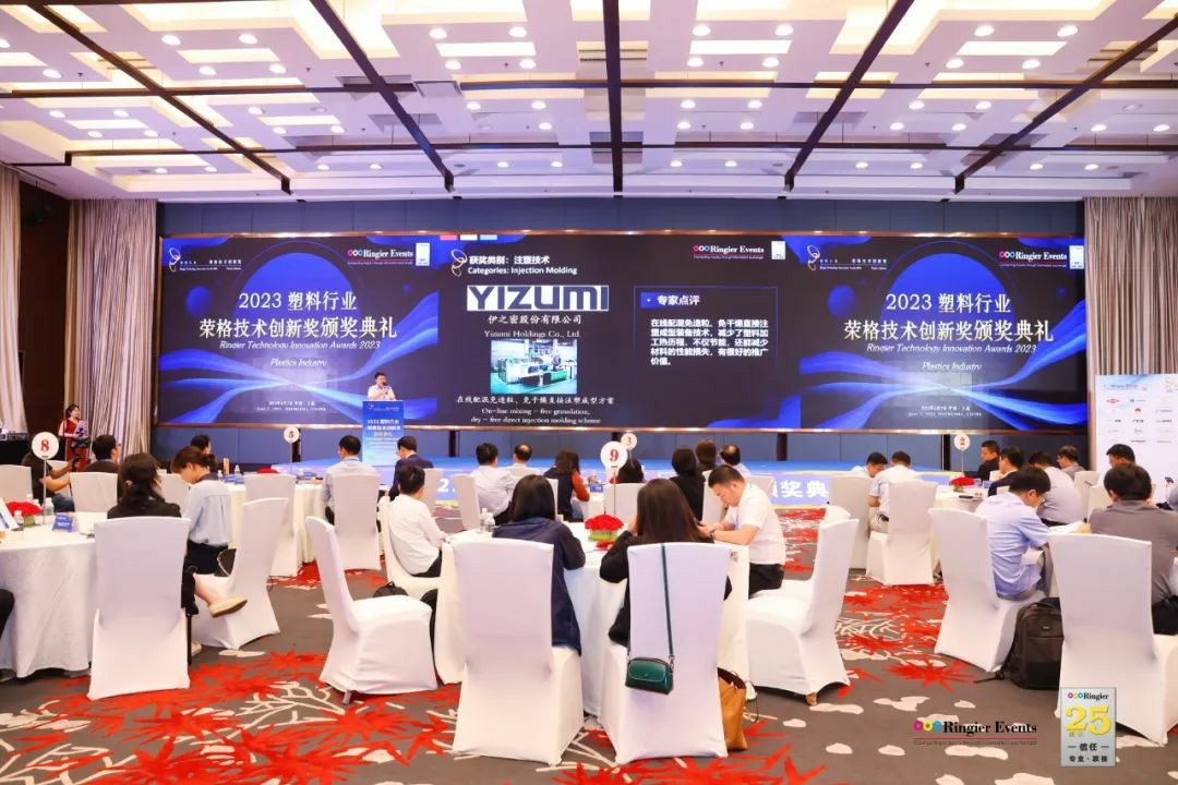伊之密股份有限公司凭借在线配混免造粒、免干燥直接注塑成型方案荣获“2023塑料行业-荣格技术创新奖”,并应邀出席此次行业盛典。