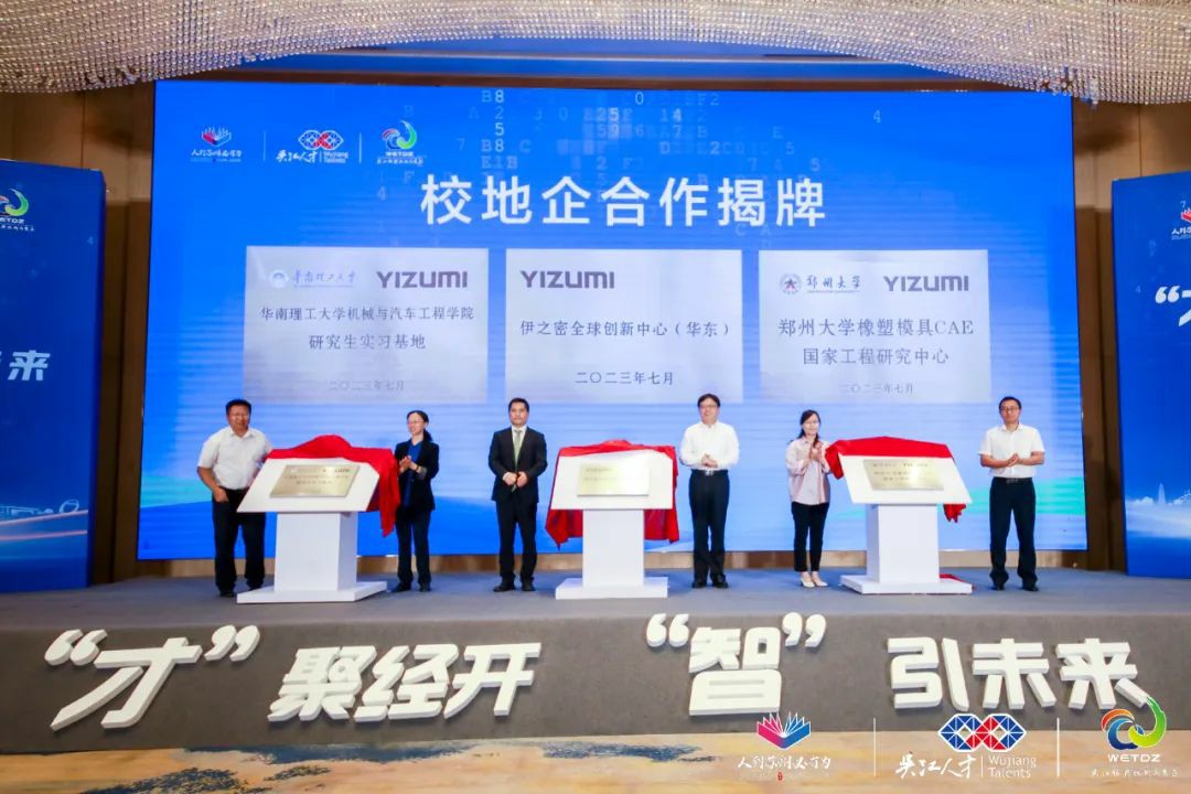 活动举行了校地企合作揭牌。吴江开发区党工委委员沈建兴先生,伊之密集团副总经理兼首席技术官周俊先生,华南理工大学冯彦洪教授,伊之密精密机械(苏州)有限公司产品线总监侯永平先生,郑州大学董斌斌教授,伊之密精密机械(苏州)有限公司技术部高级经理齐明超先生一同上台参与揭牌仪式。此次揭牌进一步为校地双方在人才培养、就业育人、科技创新、产学研合作等方面提供深度的合作机会,进一步探索并实践出成熟的、有效的、长期的校地合作模式。此外,活动还进行了人才路线发布以及全球高校数字素养赋能项目发布。将进一步为开发区进一步数字化转型提供人才支持和智力支撑。