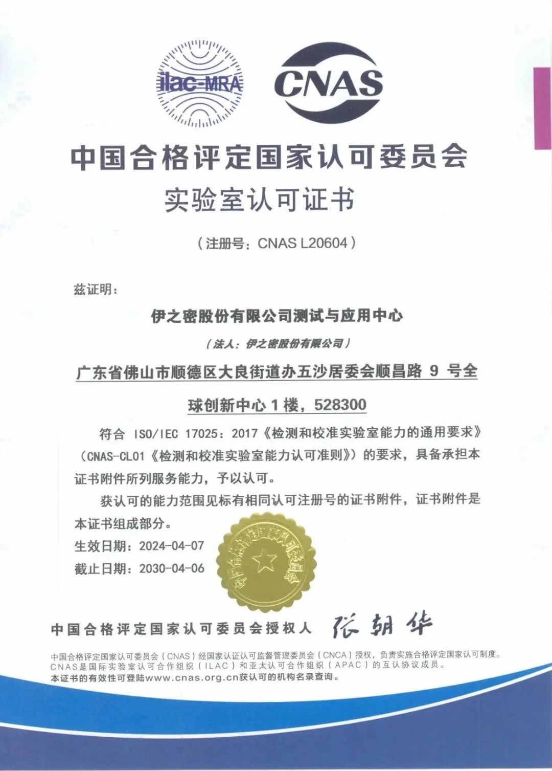 近日,伊之密测试与应用中心荣获中国合格评定国家认可委员会(CNAS)的认可资质(认可注册号L20604),并取得了国际互认联合认可标识,成为行业内少数获得CNAS认可企业之一。