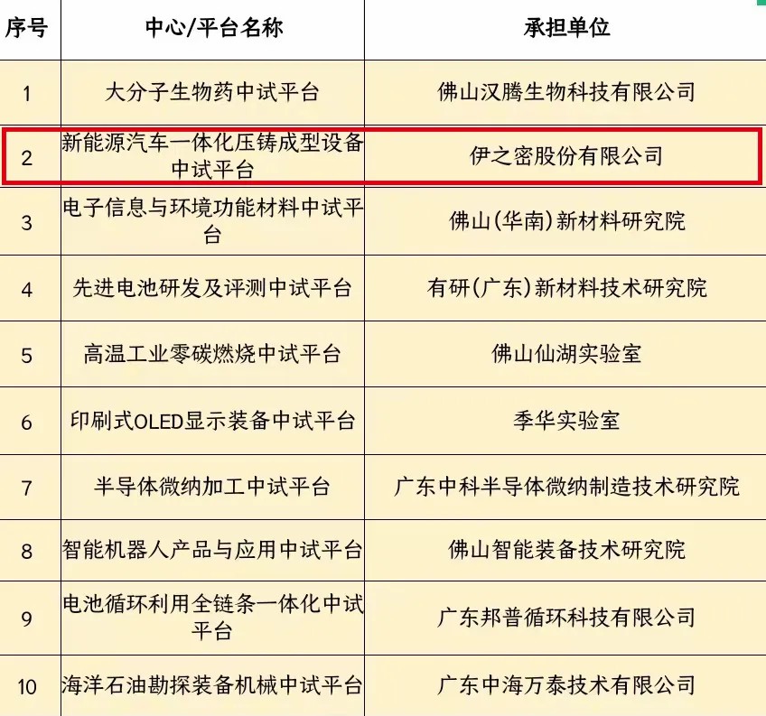 佛山推动产业与科技融合聚变、聚力培育新质生产力迈入新阶段。近日,佛山召开中试产业高质量发展大会,会议对首批概念验证中心、中试平台进行授牌, 伊之密新能源汽车一体化压铸成型设备被授予佛山首批中试平台。