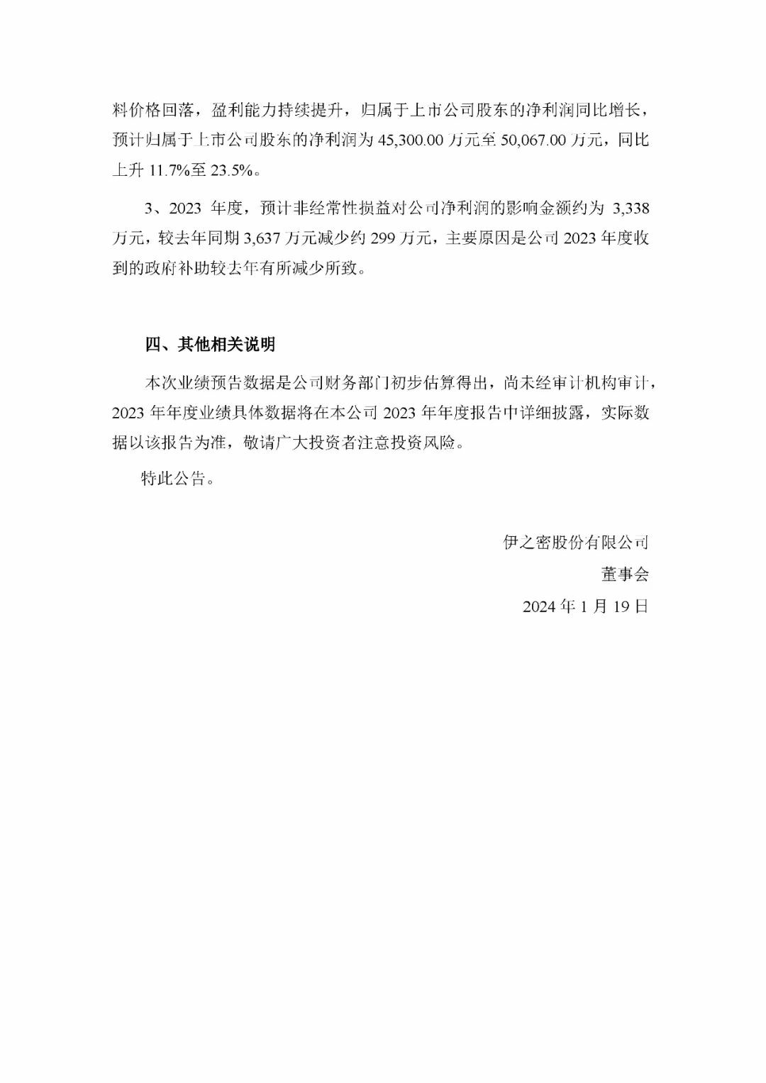 另外,2023 年度,公司上下齐心协力,积极开展各项业务工作,同时原材料价格回落,盈利能力持续提升,归属于上市公司股东的净利润同比增长,预计归属于上市公司股东的净利润为 4.53亿元至 5.01亿元,同比上升 11.7%至 23.5%,其中扣非净利润约为4.21亿元-4.66亿元,同比增长14.1%-26.2%。