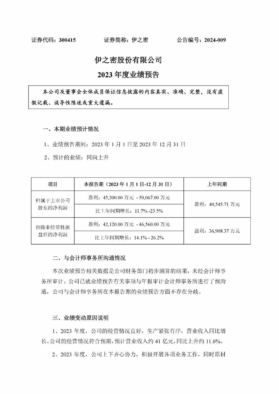 1月19日,伊之密发布2023年度业绩预告,2023 年度,公司预计营业收入约 41 亿元,同比上升约 11.6%。