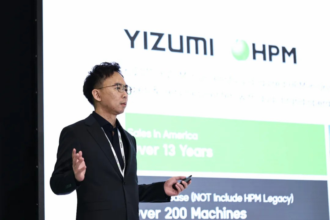活动现场,伊之密董事长兼总经理甄荣辉先生发表了致辞。他首先回顾了2011年伊之密的重要里程碑——成功收购拥有超过百年历史的美国知名机械制造商HPM及其全部知识产权。这一举措极大地增强了伊之密在国际市场上的竞争力。