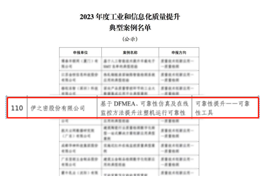 近日,工业和信息化部发布2023年度工业和信息化质量提升典型案例公示,包括50个质量管理能力、37个质量技术创新应用、42个可靠性提升案例。在可靠性提升方向,伊之密股份有限公司(以下简称:伊之密) “基于DFMEA、可靠性仿真及在线监控方法提升注塑机运行可靠性”入选。