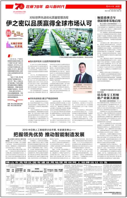 “成立17年来,伊之密始终视产品质量为生命。”2019年“佛山·大城企业家”宣传对象、广东伊之密精密机械股份有限公司董事长陈敬财表示,怀着打造世界级质量产品的初心,伊之密一手潜心提升技术实力,一手优化质量管理流程,不断对标全球先进制造企业,打造领先的质量标准。
