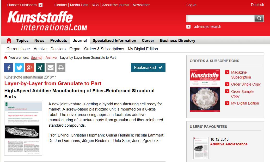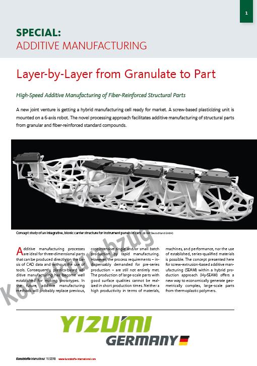 在英文杂志Kunststoffe international的11月刊上,伊之密机器人柔性增材制造系统 SPACE A也上了头条—— “德国伊之密正在准备向市场推出一种将螺杆式塑化装置固定在六轴机器人上的混合式制造单元。这一新式的加工方法实现了用颗粒和标准纤维增强混合物进行结构件的增材制造。”