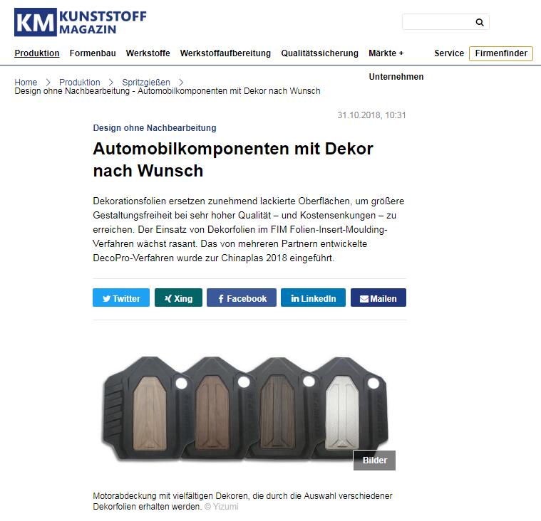 Kunststoffe Magazin 是世界著名的塑料行业媒体品牌,德国排名前二的塑料行业杂志,在德语国家发行量位居第一(IVW认证)。此次Kunststoffe Magazin 2018年11-12双月刊,介绍了伊之密FoamPro+DecoPro(微发泡+模内装饰)解决方案。该方案由伊之密与合作伙伴联合开发,在2018年Chinaplas上成功展示汽车发动机盖成型,获得市场良好回应。