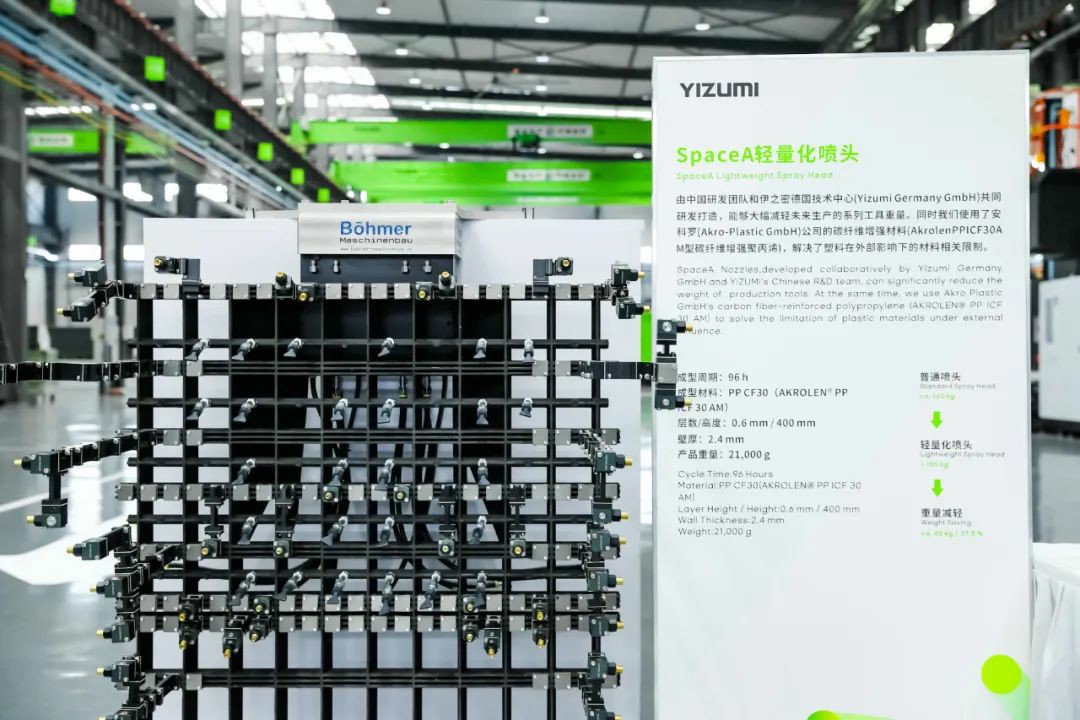 SpaceA轻量化喷头,由中国研发团队和伊之密德国技术中心共同研发打造,能够大幅减轻未来生产的系列工具的重量。同时我们使用了安科罗(Akro-Plastic GmbH)公司的碳纤维增强材料(AkrolenPPICF30AM型碳纤维增强聚丙烯),解决了塑料在外部影响下产生的相关限制。