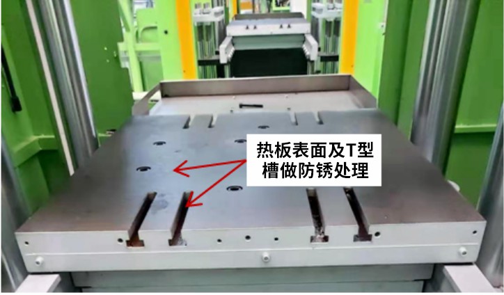 • 橡胶机在停机前,应将模具的上模板放下,保证模具上下模板是在合模状态,以达到对模腔进行保护,同时需要开模到底,保证锁模柱塞在主油缸内,对柱塞表面起防锈作用,更好地保护模具和锁模机构;• 开模后,对上下热板表面及T槽进行清洁及加防锈油进行防护处理。