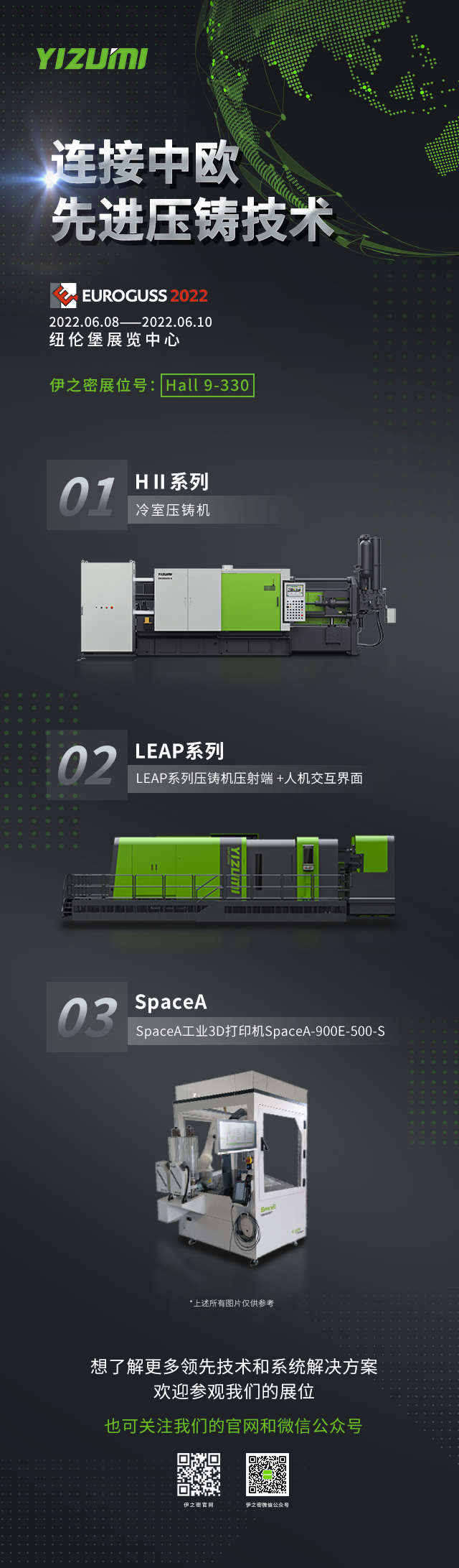 作为中国参展商之一,伊之密将在展会上详细介绍全新LEAP系列压铸机的ORCA控制系统、HII-S系列冷室压铸机的核心性能及亮点。同时,伊之密SpaceA工业3D 打印机 SpaceA-900E-500-S也将亮相展会。