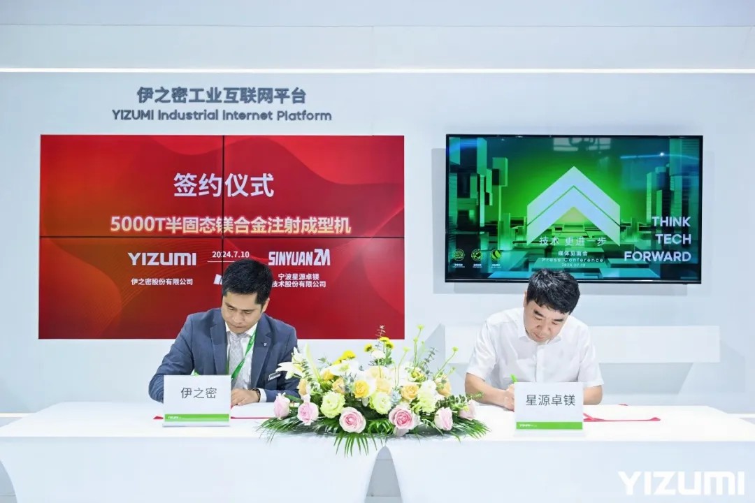 在伊之密(展位号:N1馆A22)活动区,宁波星源卓镁技术股份有限公司(以下简称:星源卓镁)与伊之密签署战略合作协议,订购一台5000T半固态镁合金注射成型机。