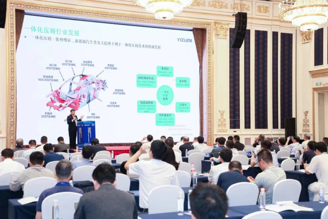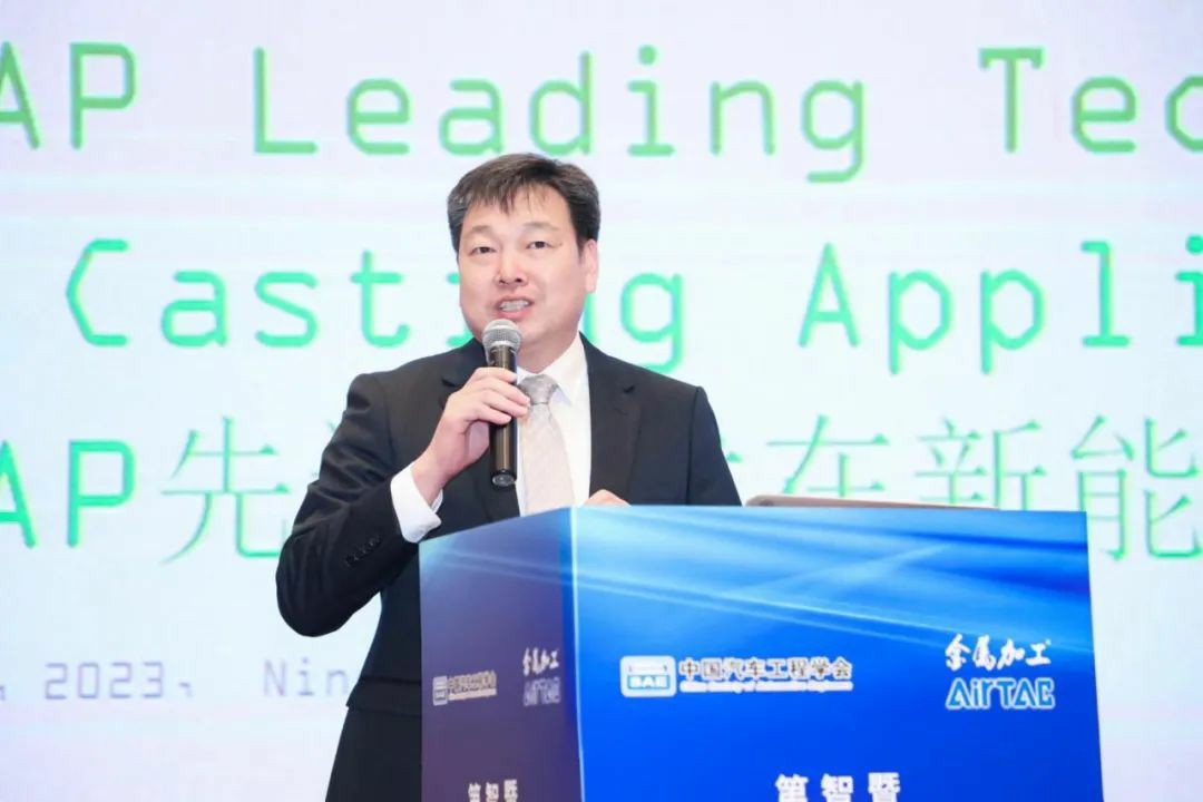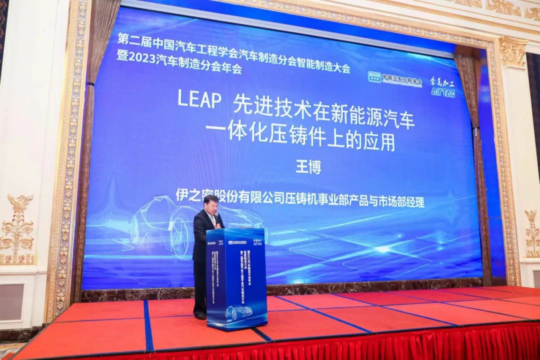 会上,伊之密股份有限公司压铸机事业部产品与市场部经理王博发表了题为《LEAP先进技术在新能源汽车一体化压铸件上的应用》专题报告。他介绍了一体化压铸的发展历程,解析了一体化压铸为何受追捧?阐述了伊之密为应对一体化压铸更高的工艺要求,通过连接全球智慧,从智能压铸岛集成,模具设计和铸造工艺优化等方面出发,让技术得到实质性的突破,并在关键性能上全面对标国际一流压铸机型。