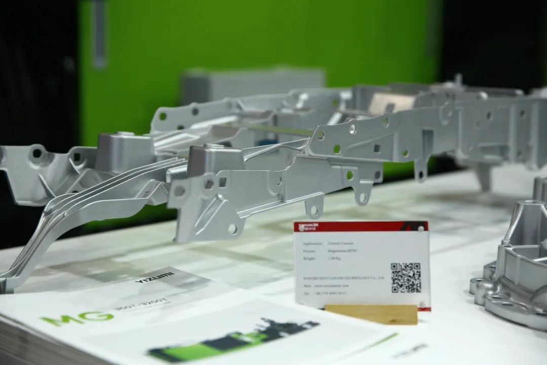 除了高端压铸设备,伊之密还携手战略合作伙伴星源卓镁共同展出了款式多样的镁合金制品,种类涉及车灯散热支架、座椅扶手骨架等汽车类压铸件等,吸引了往来商客的广泛关注。这些制品是由伊之密半固态镁合金注射成型机制作而成,充分展示了伊之密制造的实力。