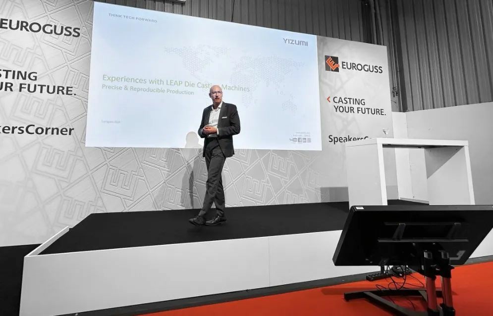 当地时间1月16日下午,在展馆现场的“Speakers Corner”上,伊之密股份有限公司压铸机事业部副总经理兼压铸及金属成型首席战略官史蒂芬•费睿泽先生分享了《伊之密LEAP系列压铸机的制造经验和使用体验》,演讲围绕有趣的案例故事展开,展示了伊之密LEAP系列压铸机对标世界一流压铸机的性能优势。