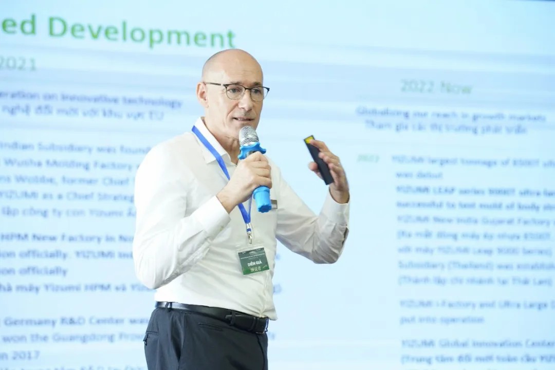 越南市场对压铸机的需求持续增长,特别是在汽车、摩托车、家电、建筑等领域。随着越南汽车工业的蓬勃发展,压铸机的应用需求进一步释放。伊之密不断调整和优化产品策略,以满足客户多样化的需求。研讨会上,伊之密压铸机事业部副总经理兼压铸及金属成型首席战略官史蒂芬•费睿泽先生通过《伊之密集团简介》的演讲,向与会者阐述了伊之密的发展历程、核心技术、市场布局及未来战略,还通过生动的案例与数据,全方位展现了伊之密在金属成型领域的领先地位与卓越成就。