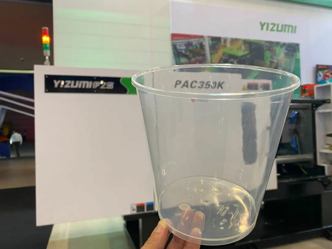 在伊之密展位上,运用FF120、PAC350K两款注塑机,现场生产PC杯子、3.5L薄壁桶。伊之密高效而稳定的机器性能吸引了众多商客青睐。