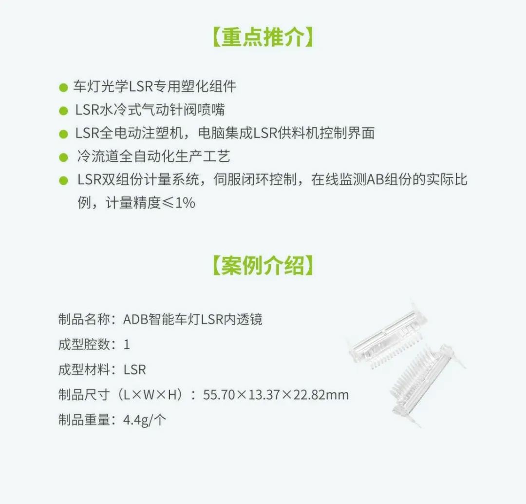 作为一家装备制造企业,伊之密紧紧抓住这个机遇,结合上海当地产业特色和客户需求,着眼大局精准谋划。此次在汽车应用领域上,伊之密重点展示了ADB智能车灯LSR光学内透镜全自动化成型整体解决方案。