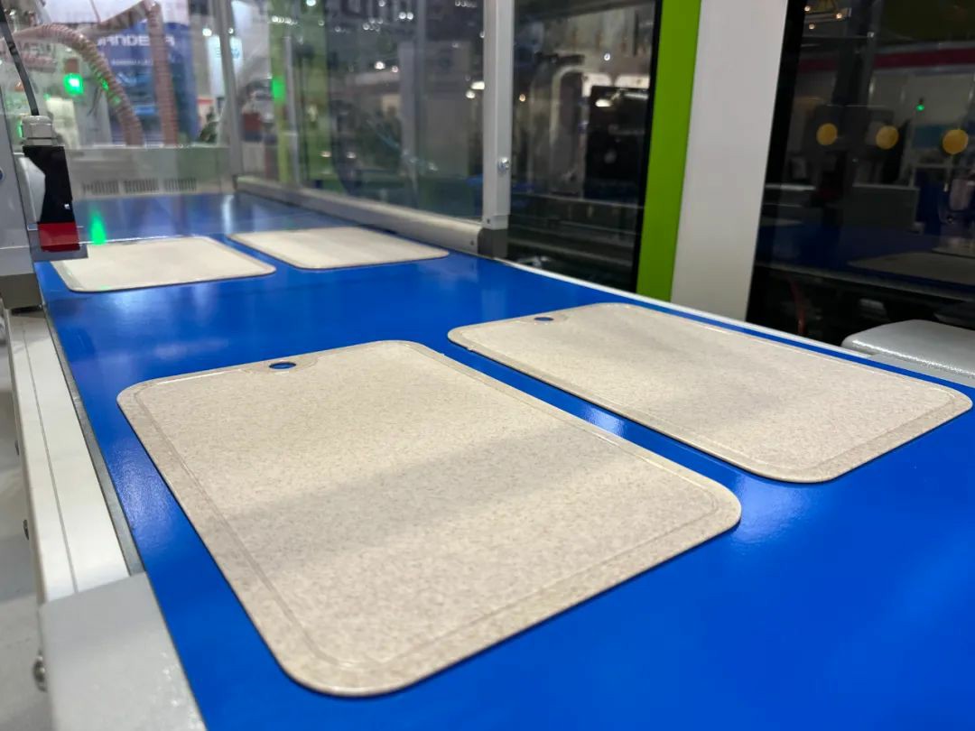展会上,伊之密(展位号:3A-GG10)运用UN220A5-EU搭配机械手YR1000S3,现场生产菜板。其中,木塑材料菜板成型方案采用木塑专用塑化组件,生产菜板等日用品,节约塑料用量,实现废物再生利用,实现低碳绿色生产。