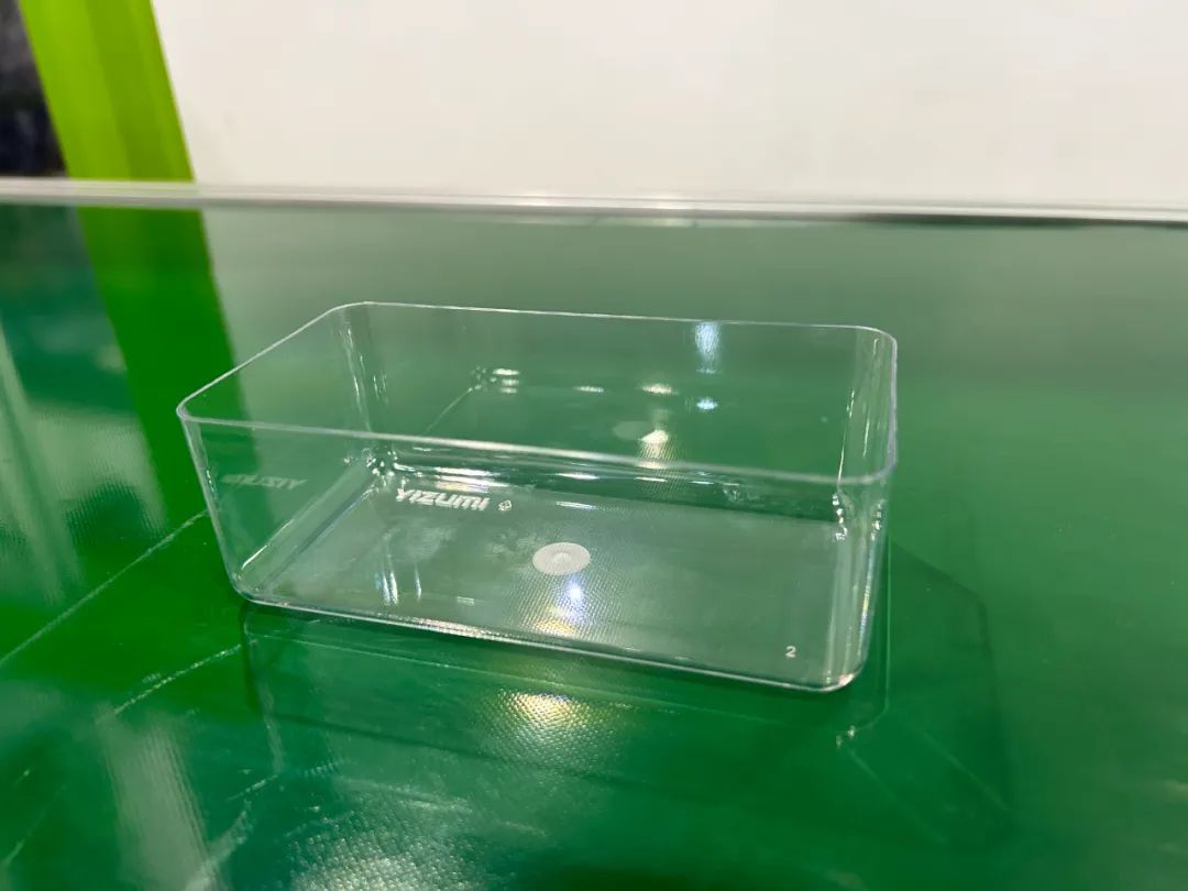 伊之密PAC250薄壁高速注塑机搭载了全新研发的PET薄壁包装盒成型模具。相比传统薄壁注塑产品采用PS或其他材料制作,PET材料制作的包装盒子质感更高,材料环保易回收、价格更低,为客户提供一个新的包装设计思路。