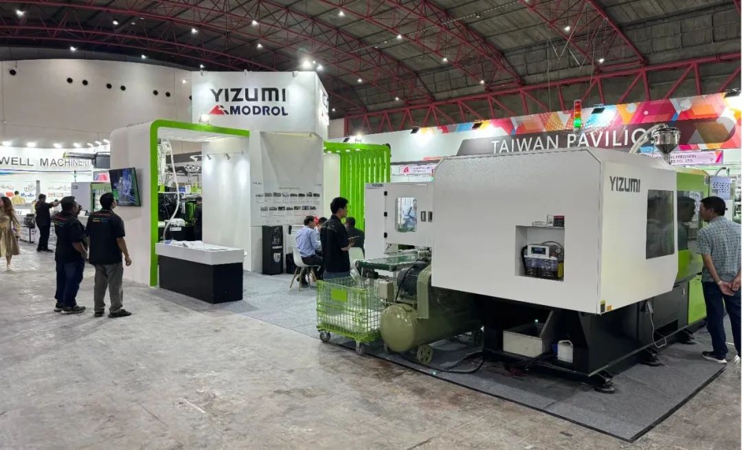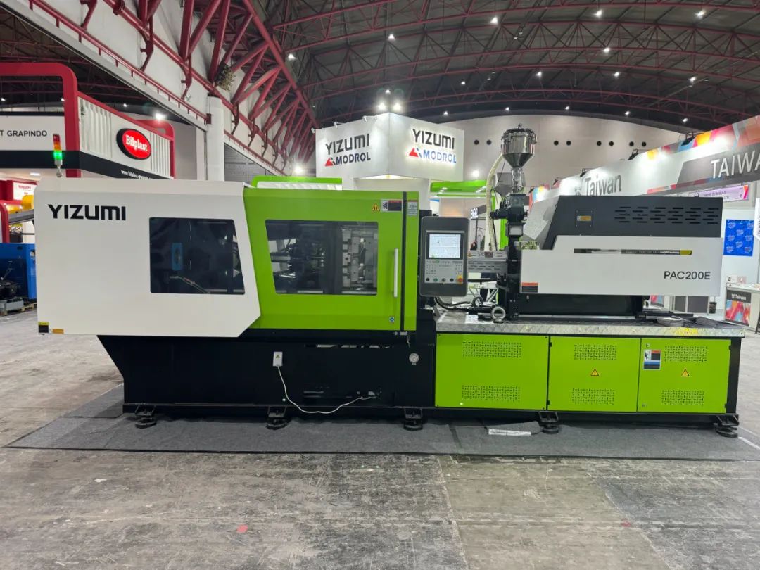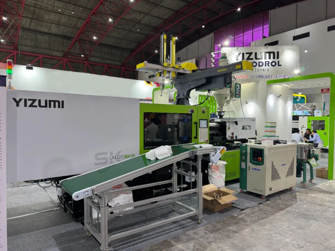 在伊之密(展位号:A-1402)展台中央,伊之密全新SKⅢ系列注塑机UN320SKⅢ重磅亮相,它以简约明快的机身线条,配合品牌辨识度极高的色彩——生命绿、君子白、深邃灰,营造出简约而不简单的工业风,牢牢抓住往来宾客的视线。