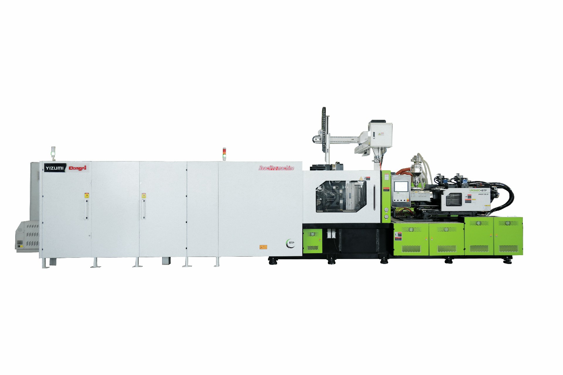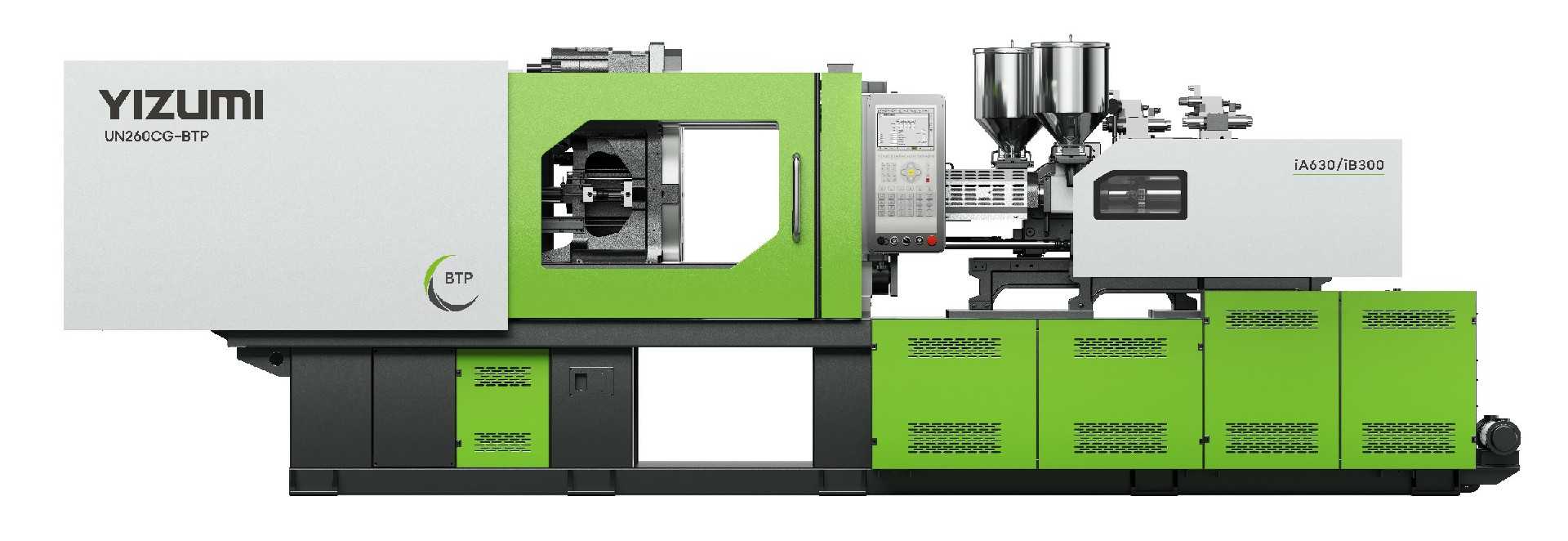 UN280CG-BTP 五加仑双色水盖 (20+20) 专用机,机器配备高效防粘塑化系统、第三代电动伺服转盘控制系统、开模同步转盘技术、绿色塑化技术、TieBarFree 技术、开合模线轨导向技术,结合高速机械手取件,为 1 出 2 的五加双色水盖提供长期稳定高效低能耗生产的系统性解决方案。