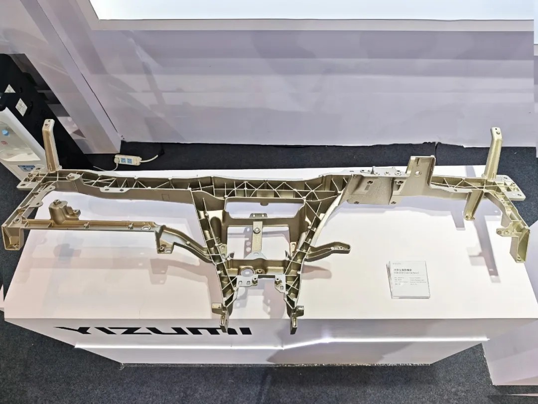 本次展会,伊之密以制品诠释技术纵深。展台上,一系列高精度、高性能的制品吸引了众多观众的目光。其中,汽车仪表盘横梁、方向盘等镁合金结构件尤为引人注目。这些制品质地轻盈、结构复杂,充分展现了伊之密MG系列半固态镁合金注射成型机在轻量化领域的应用。