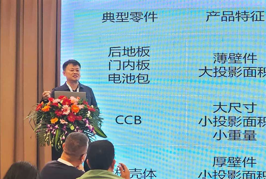 展会期间,伊之密镁合金半固态注射成型市场经理陈勇先生作了题为《廉镁时代下的半固态镁合金注射成型》的分享,深入解读了镁合金材料的优势、行业发展趋势及伊之密的核心技术突破,引发与会者的广泛关注。陈勇提到:早在 2009年,伊之密已启动半固态镁合金注射成型项目,经过多年的技术研发和创新,已成功打破国外垄断,实现了半固态镁合金注射成型装备的国产化。目前,伊之密的半固态镁合金注射成型装备已达到国际先进水平。伊之密不仅在设备研发制造方面取得了突破,还构建了半固态镁合金产品开发的技术体系,提供从材料数据,力学、模流仿真,模具设计制作,样件制作等一站式服务,使复杂件、大型件的开发高效落地,从而大幅降低了开发难度。