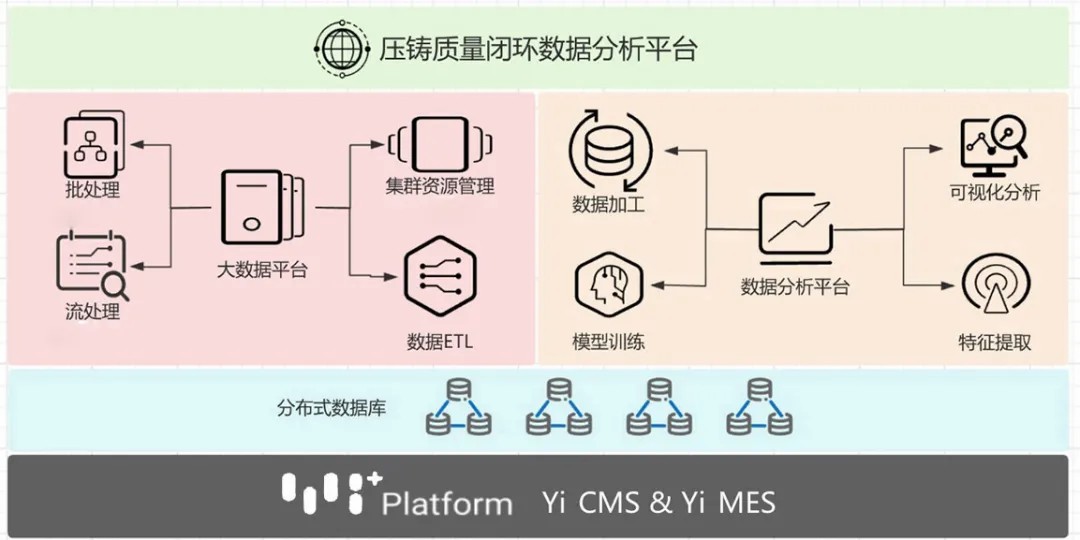 在设备联网和生产信息化的基础上,智慧铸造解决方案进一步构建了压铸质量闭环数据分析平台。该平台以大数据技术为核心,通过整合Yi CMS、Yi MES等系统的数据资源,高效完成工艺大数据的清洗、加工及特征提取工作。在此基础上,我们构建了工艺过程的数字化模型和数据分析工具,为工艺优化和质量控制提供了强有力的数据支撑。